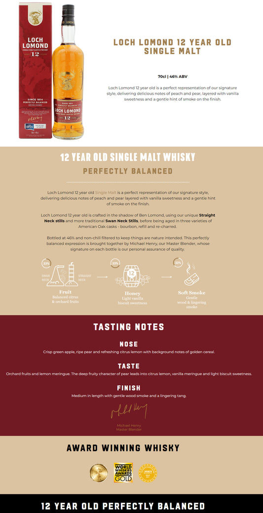 Loch Lomond 12 Year in Specially Selected American Oak Casks Perfectly Balanced Highland Single Malt Whisky ABV 46% Vol 70cl / 700ml