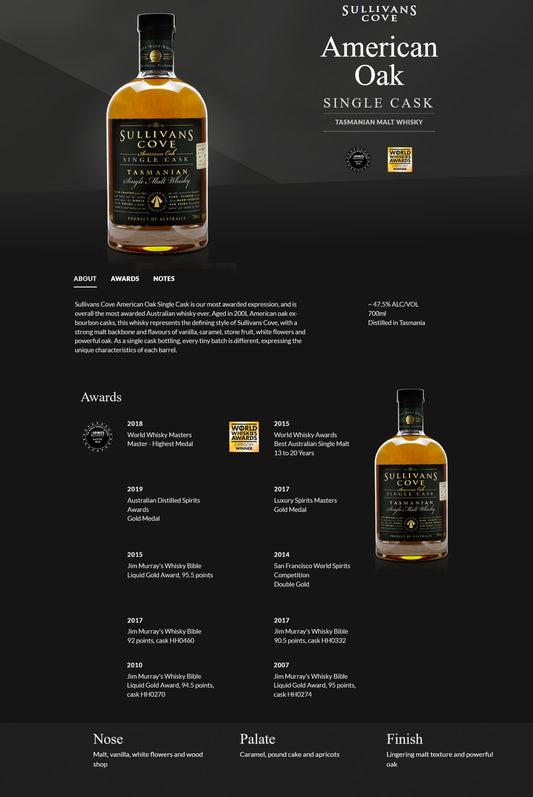 The first move made by Patrick was to relocate the distillery 20 minutes away to Cambridge, as the site was much better suited to large scale whisky production. The focus was to create a top quality Australian single malt whisky and Patrick was at the helm, redesigning everything from their production methods to the now iconic packaging. Sullivans Cove whisky became a stable Australian choice in the domestic market in the years that followed, but would see major international success when in 2014 French Oak HH0525 won “best single malt whisky in the world” at the World Whiskies Awards in London. This would be followed up by American Oak HH0351 winning “best single cask single malt” in 2018, along with French Oak TD0217 winning the same award in 2019. Suddenly the world was aware that Australians are making some of the world's best whisky and international demand for Sullivans Cove products shot through the roof. With every release now being available only by a ballot and some of the world’s best bottlers, critics and collectors looking towards Sullivans Cove, it's fair to say their whisky is the most sought after in Australia. Of note is the TD vs HH tags applied to each cask type filled. The HH moniker refers to Highland Holdings, the company that owned SC from 1999 until 2003/04 whereas the TD symbol suggests ‘Tasmania Distillery’, the name of the distillery from 2004 until 2016. Barrels filled since 2016 will begin to appear under the ‘SC’ tag.