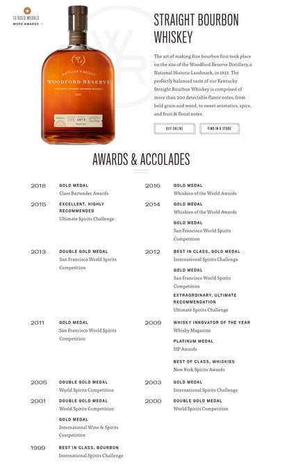 The perfectly balanced taste of our Kentucky Straight Bourbon Whiskey is comprised of more than 200 detectable flavour notes, from bold grain and wood, to sweet aromatics, spice, and fruit & floral notes. Woodford Reserve is built around flavour. The bourbon has a rich texture of flavours that create opportunities for cocktail and food pairings. Woodford Reserve is designed with perfectly proportioned flavours of depth and complexity.