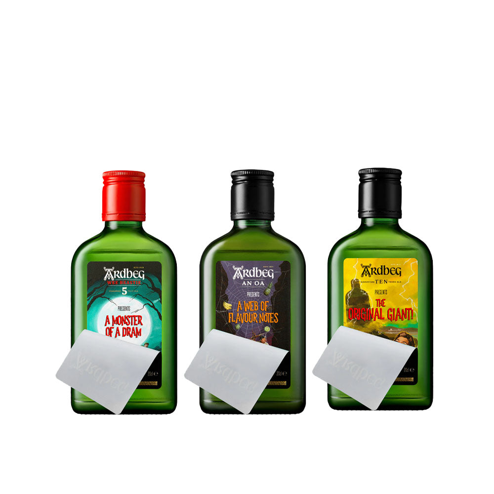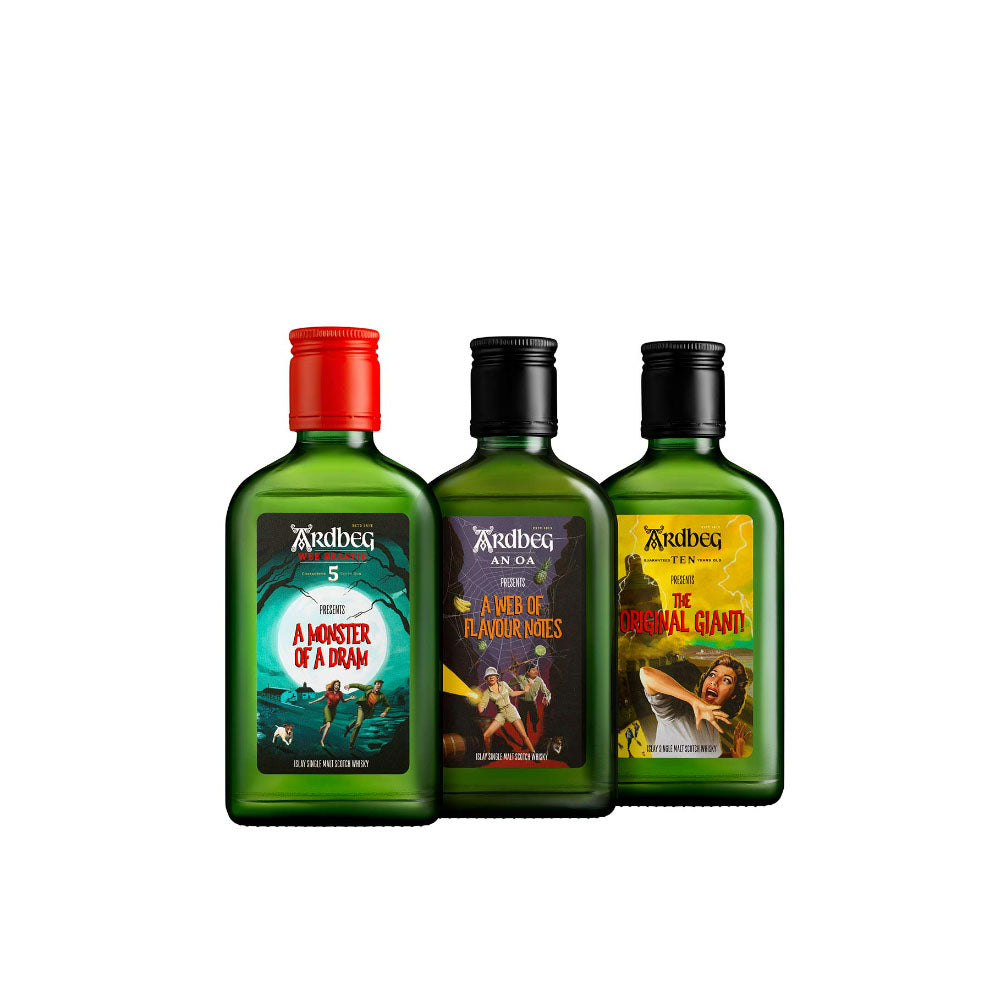 Containing a 20 cL bottle each of Ardbeg's iconic smoky single-malt whiskies, the Monsters of Smoke trio unleashes flavour in a big way. Each collectable bottle is decorated with a unique artwork hiding beneath the label. Peel to reveal yours.