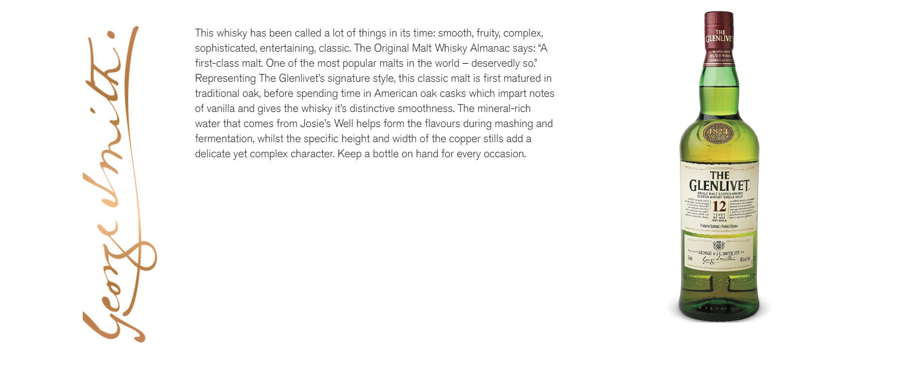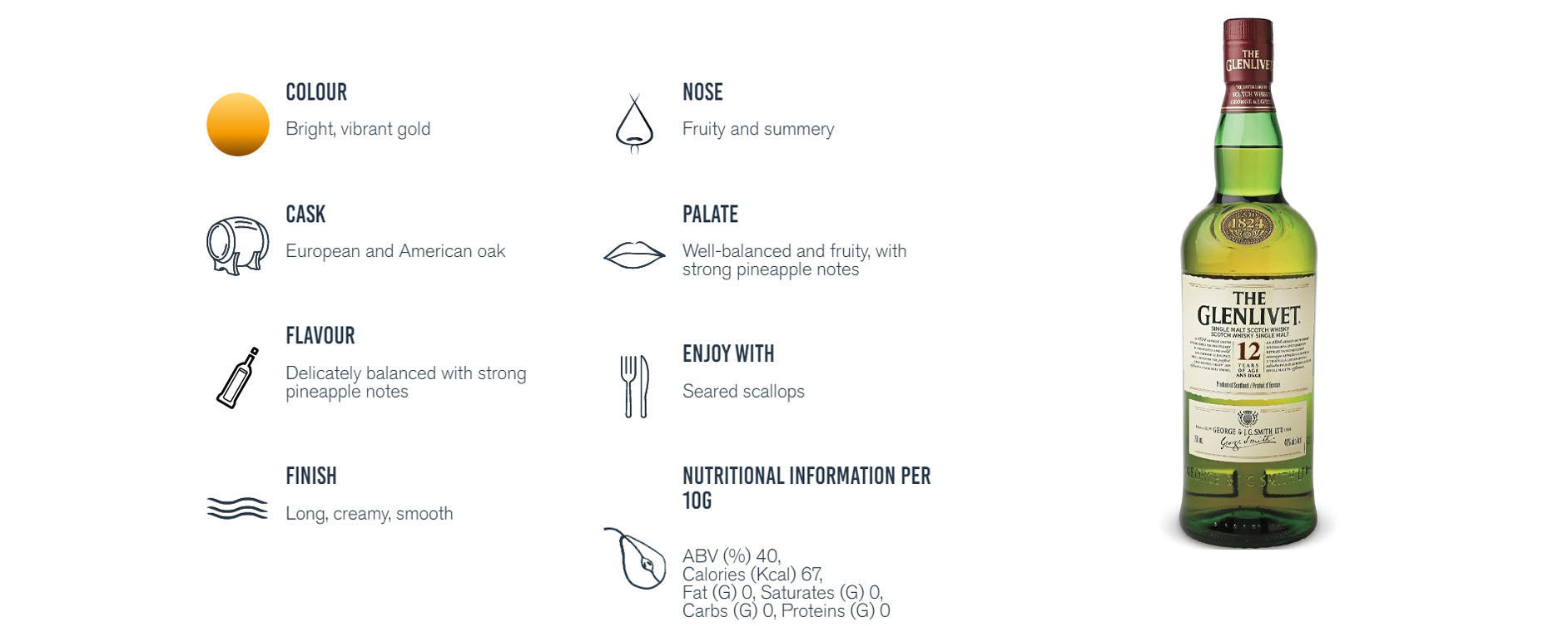 The entry level bottling from the illustrious Glenlivet distillery at Speyside’s heart, aged for 12 years. The archetypal Speyside dram, honey and orchard fruit driven. The nose is sweet creamy vanilla, honey, pineapple, vanilla, pressed apples and a little cinnamon.The palate is apple cores, fresh and fruity trifle and creamy citrus.The finishing is long and delicious with almonds and apple. The Glenlivet 12 is famously smooth and elegant with a defining fruity pineapple note, making it an accessible and popular whisky the world over. Appearance : Pale amber. Nose : Floral and vanilla notes seasoned with dried fruits. Palate : Aromas of vanilla and coconut and ripe fruit and orange marmalade flavours. Overall : Woody and slightly spicy, envelops the palate in warmth. Long-lasting with a hint of almond.