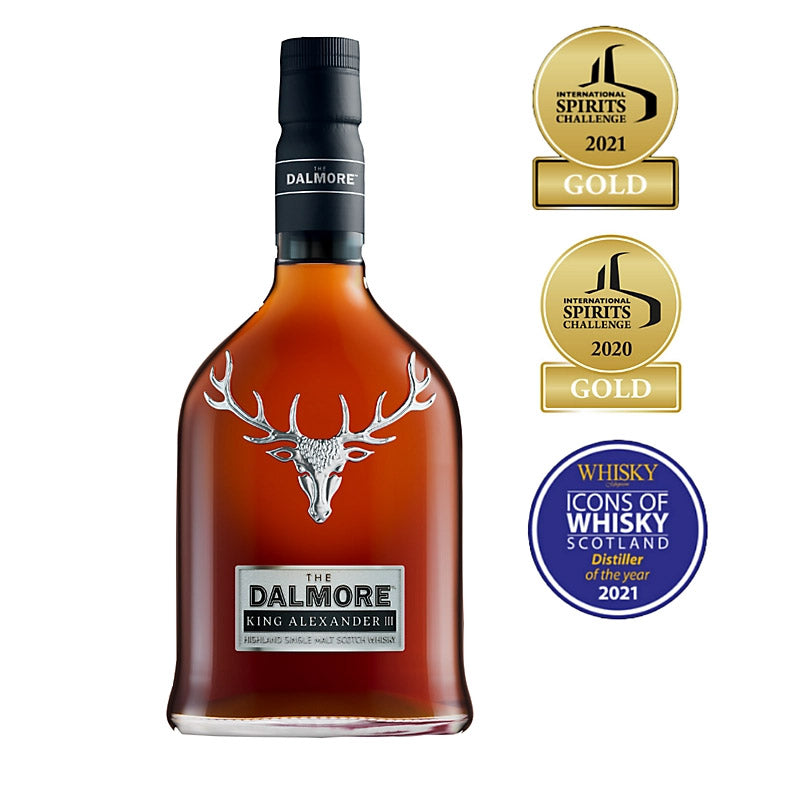 A sextuple-wood bottling from Dalmore. This auspiciously named single malt Scotch whisky was matured in wine, Madeira, Sherry, Marsala, Kentucky bourbon and Port casks. King Alexander III is a rich, fruity Highland single malt.