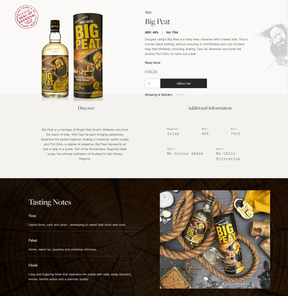 Douglas Laing's Big Peat is a feisty Islay character with a sweet side. This is a small batch bottling, without colouring or chill-filtration and only contains Islay Malt Whiskies, including Ardbeg, Caol Ila, Bowmore and (even the elusive) Port Ellen, to name but a few!