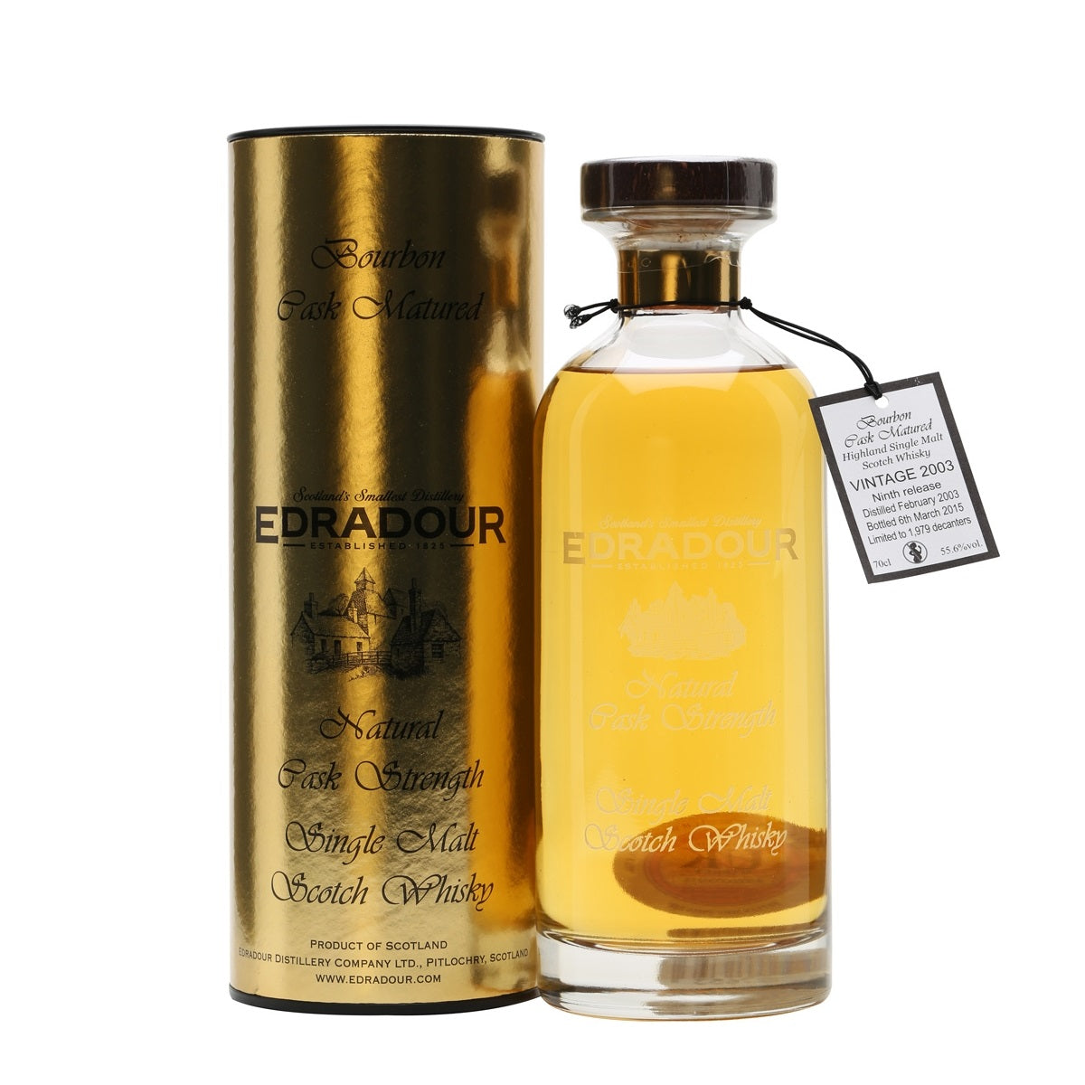 Edradour 2003 Bourbon Cask Decanter Carafe 12 Year Old. The ninth release of Edradour's limited-edition 2003-vintage bourbon-cask whisky. Distilled in February and bottled at 12 years of age on 6 March 2015. A beautifully presented release from the Highlands's smallest distillery.
