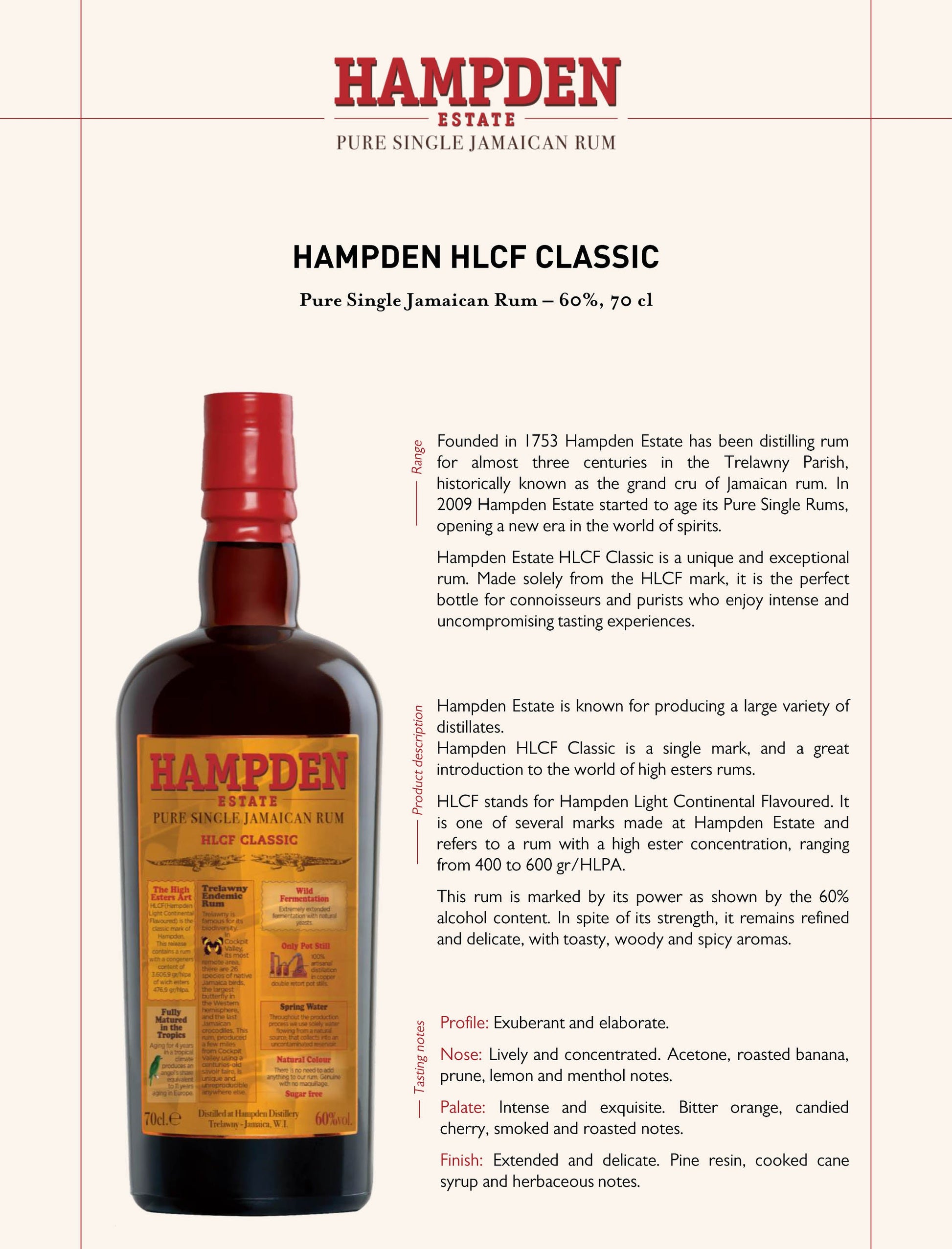 An intense and characterful rum from Jamaica's Hampden Estate, made solely from the HLCF (Hampden Light Continental Flavoured) mark and matured for four years in the tropical Jamaican climate. This is a prime example of the robust, funky expressions to be produced at the legendary distillery. Weighing in at a generous 60% ABV, the bold, powerful rum retains plenty of tropical character, with layers of rich oak char, exotic fruit, and woody spice.