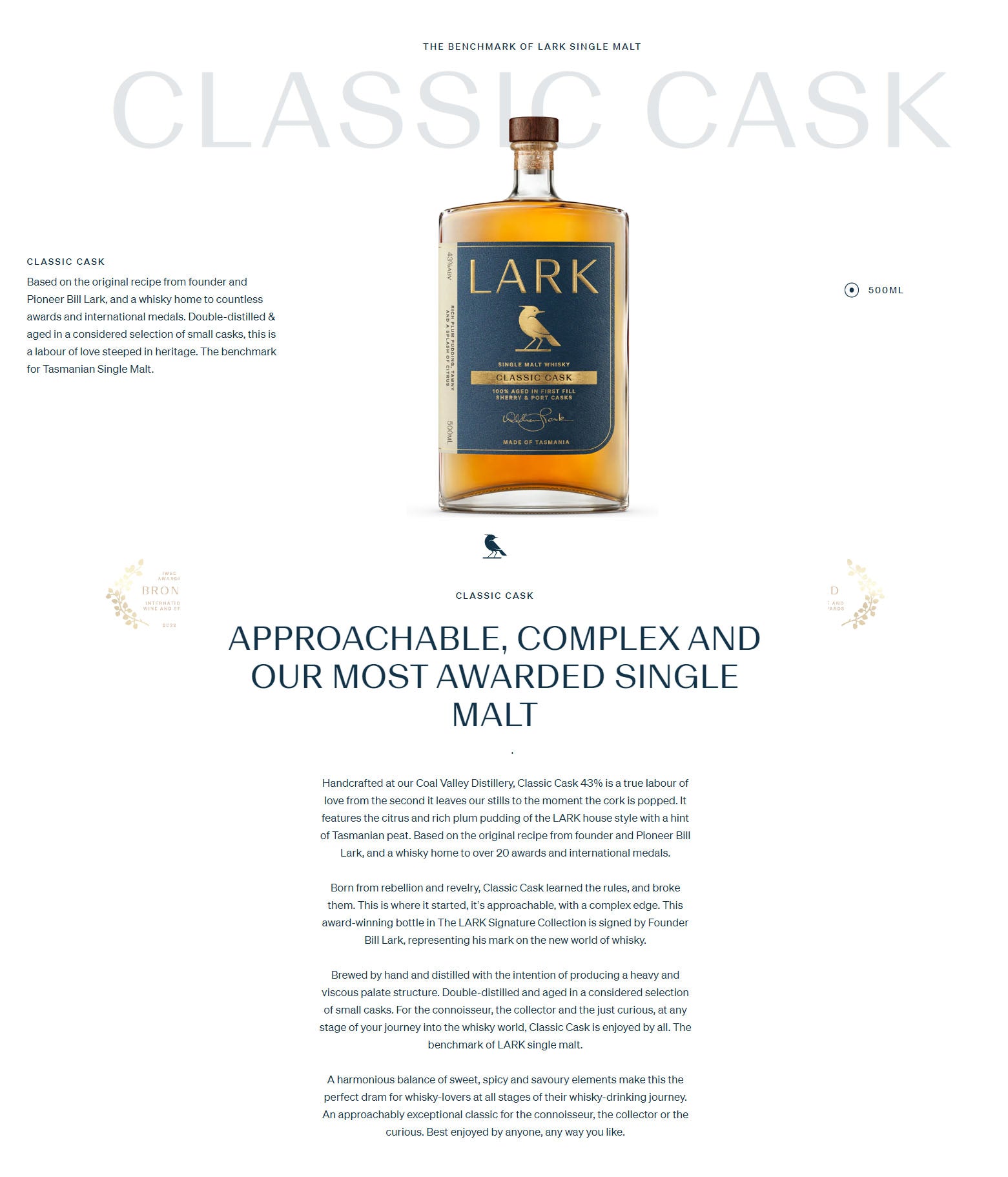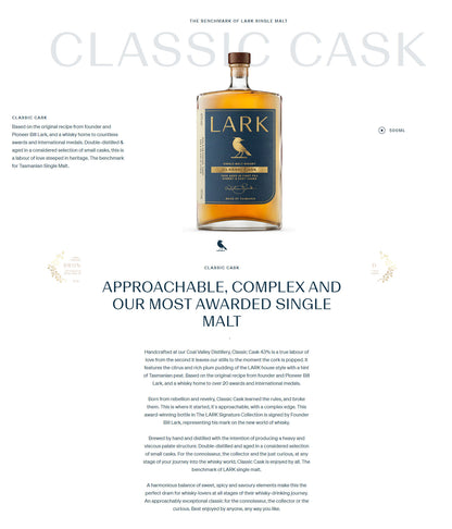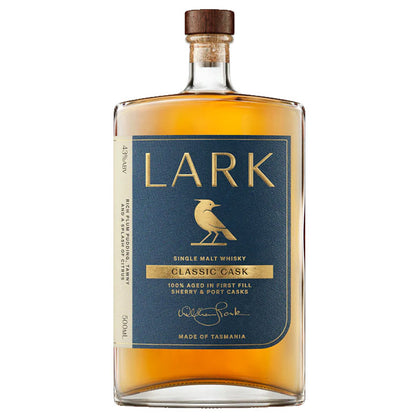Lark Classic Cask Single Malt Tasmanian Whisky 100% Aged in First Fill Sherry & Port Casks ABV 43% Vol 500ml / 50cl