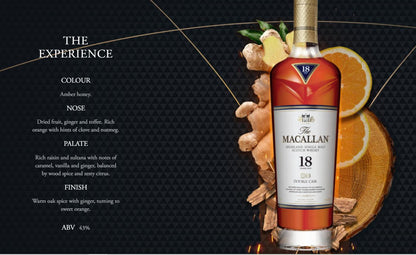 With golden hues heightening the colour of the whisky and reflecting the key flavour notes of treacle toffee, sweet ginger, dried fruits and nutmeg, The Macallan Double Cask 18 Years Old stands proud as a marker of extraordinary craftsmanship.