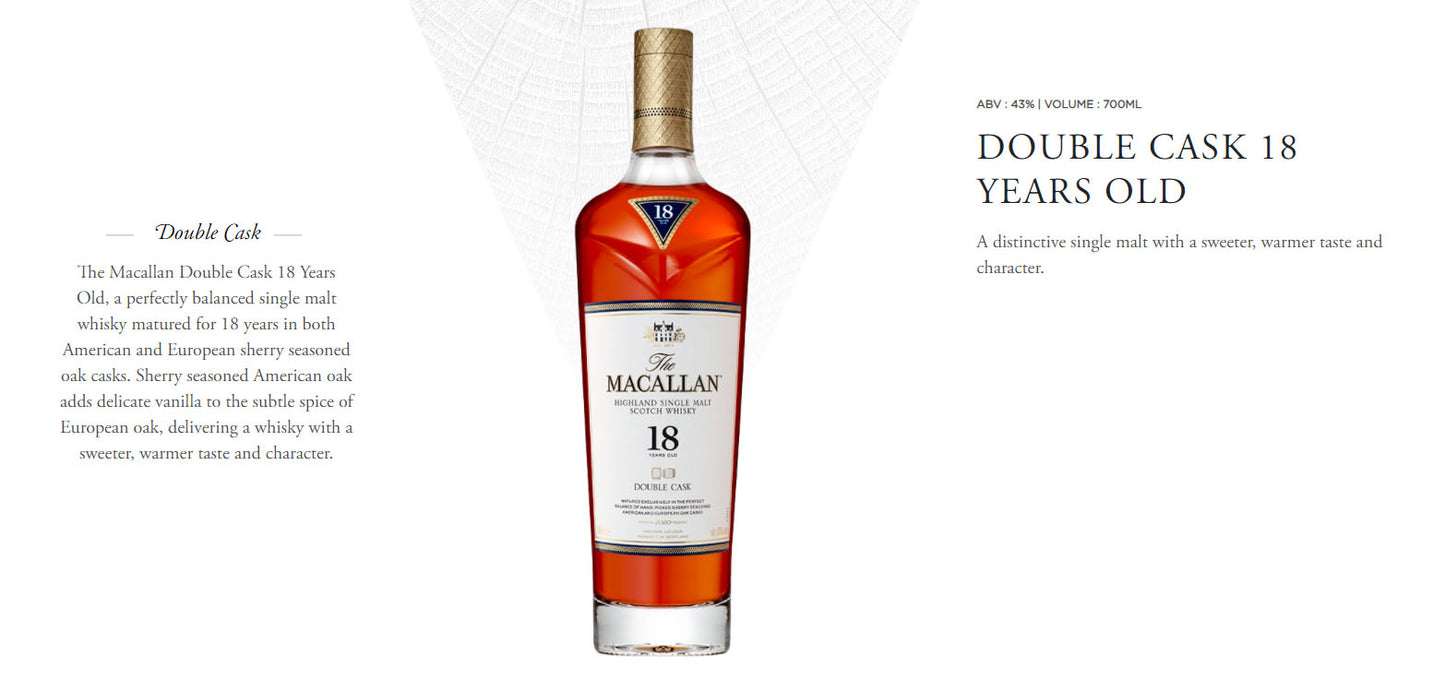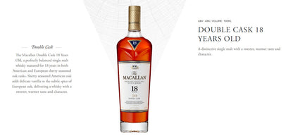 The Macallan Double Cask 18 Years Old, 2022 Release, a perfectly balanced single malt whisky matured for 18 years in both American and European sherry seasoned oak casks. Sherry seasoned American oak adds delicate vanilla to the subtle spice of European oak, delivering a whisky with a sweeter, warmer taste and character.