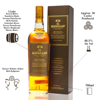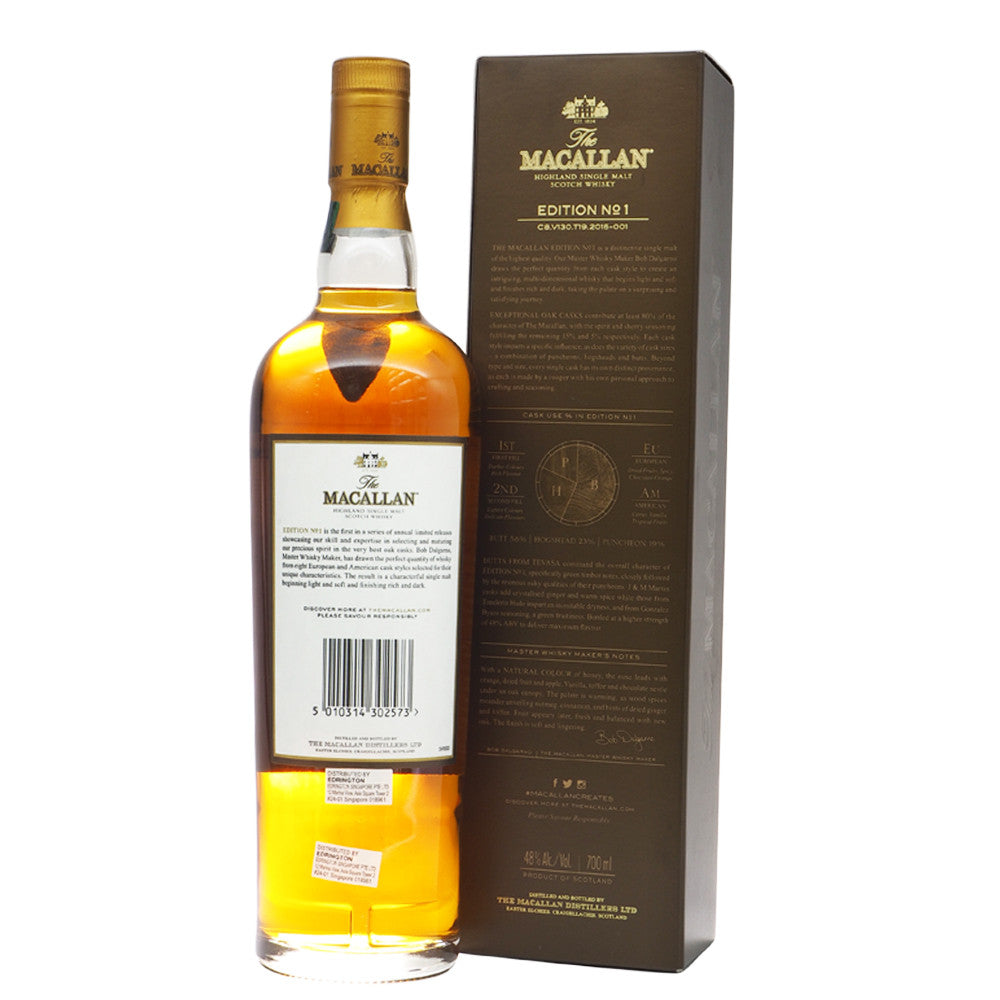 The Macallan Edition No. 1 is the debut expression in the Edition Series. It celebrates The Macallan’s unparalleled oak cask management policy that oversees the entire process from wood sourcing, to finished, seasoned cask. It also showcases the profound influence of The Macallan’s exceptional oak casks into the flavor of the whisky. The result is a bold single malt drawn from eight of the finest European and American oak cask styles and sizes, sherry-seasoned and aged to perfection before being combined to create this rich and multidimensional whisky.