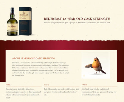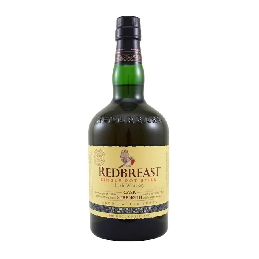 Made from a mash of malted and unmalted barley and then triple distilled in copper pot stills, Redbreast 12 boasts the flavour complexity and distinctive qualities of Pot Still whiskey. Matured in a combination of Bourbon seasoned American Oak barrels and Oloroso Sherry seasoned Spanish oak butts, the distinctive Redbreast sherry style is a joy to behold in each and every bottle. The Cask Strength expression gives a glimpse of Redbreast 12 in its natural, full flavoured taste