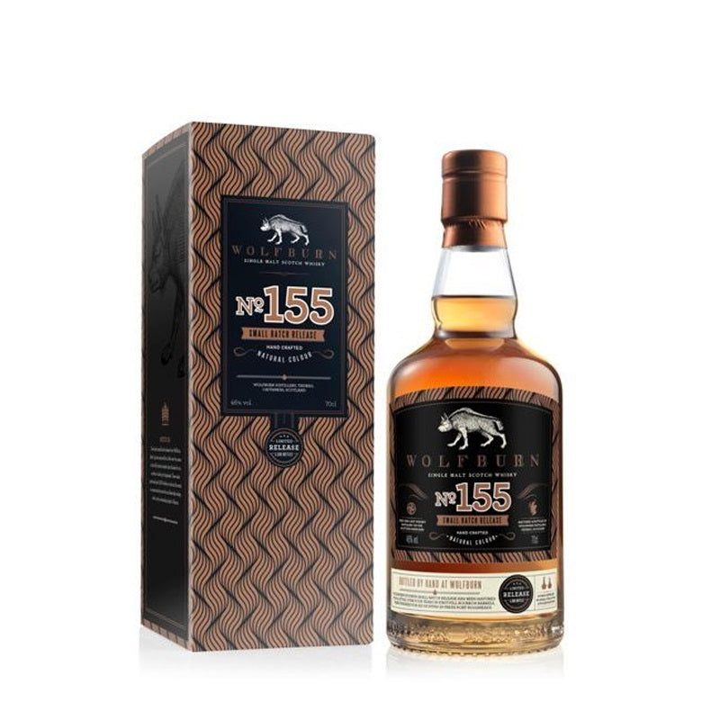 Wolfburn Small Batch No. 155. Wolfburn Distillery's fourth small-batch release, named Batch 155. Consisting of just 5300 bottles in total, it is the first whisky from Wolfburn to have been matured in one type of cask (first-fill ex-bourbon barrels for close to five years) then finished in another (six months in port hogsheads). The results are superb: a smooth, rich, easy drinking whisky, rich in colour and with a depth of sweet flavours from the port influence.